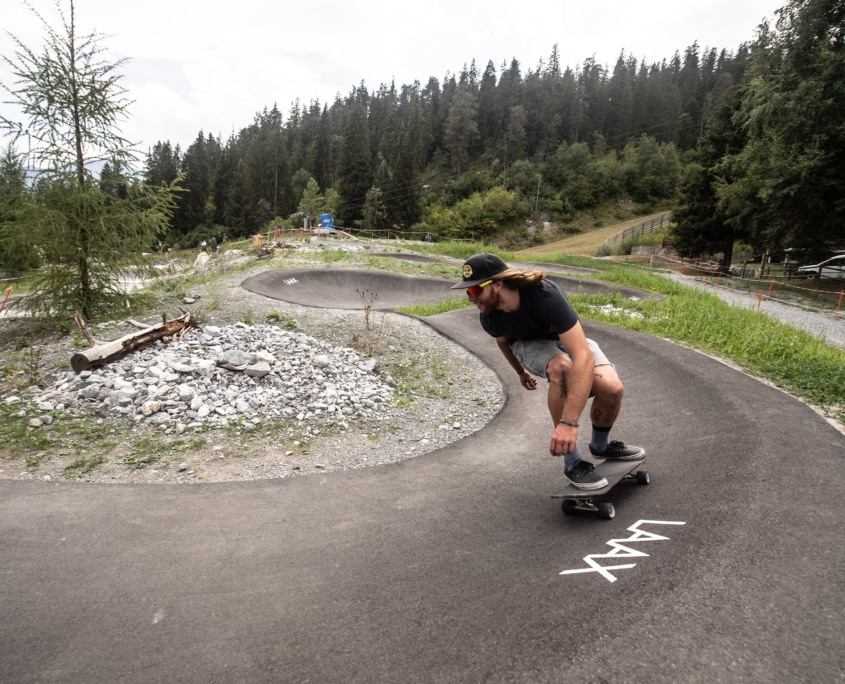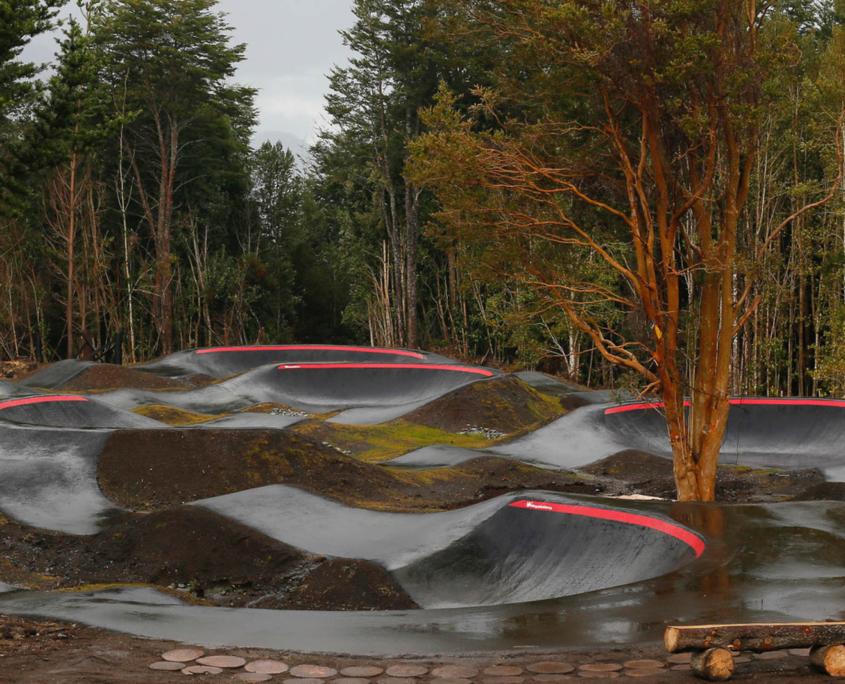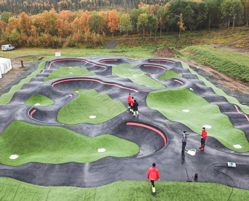 A pumptrack is an all-weather asphalt-surfaced bike track, designed in a circular way that allows the rider to pump and corner their way around a space without pedaling. It incorporates “rollers” and “berms” that help riders generate speed by pumping. Pumptracks can include things like optional jumps, differing roller shapes, and features such as wall rides, to give the riders options to ride the track in different ways.